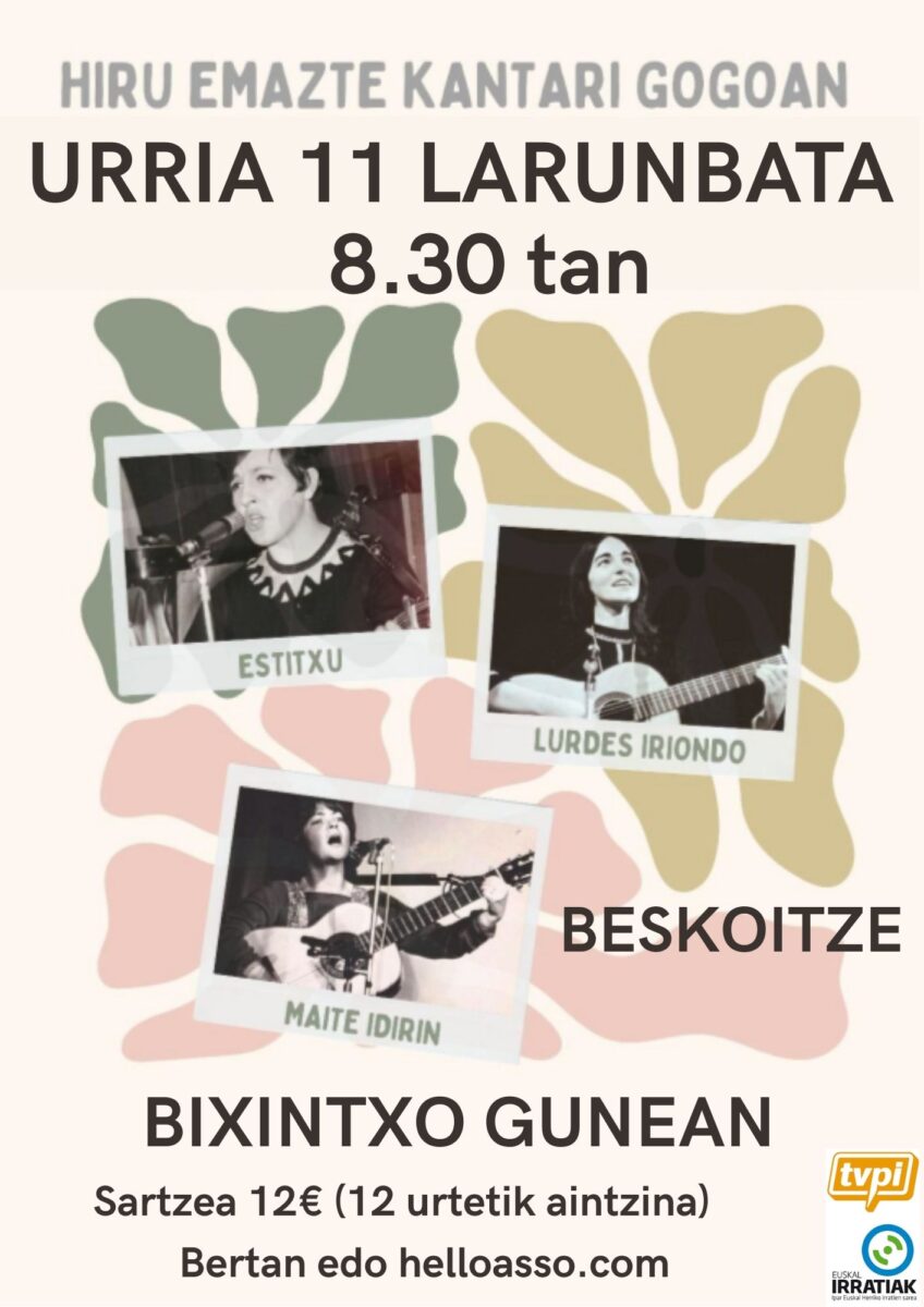 URRIA 11 LARUNBATA 8.30TAN BIXINTXO KULTUR GUNEAN BESKOITZE 1960 eta 70eko hamarkadetan emazte guti zen taulen gainean kantari. Egiazko militante lan bat egin dute : Hizkuntza, kultura, Aberria, sozial saila… …