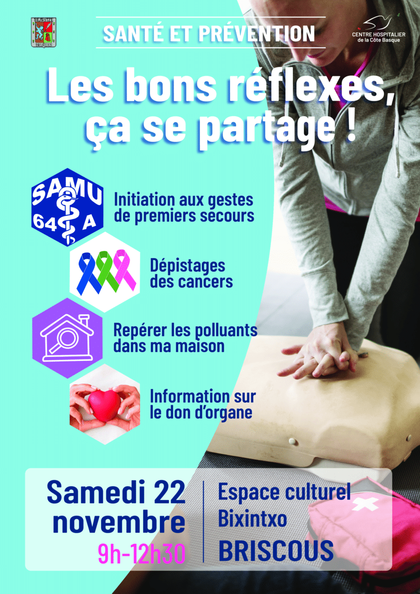 Le samedi 22 novembre, le Centre Hospitalier de la Côte Basque et le SAMU 64 vous donnent rendez-vous à Briscous pour une matinée autour des bons réflexes santé et prévention.